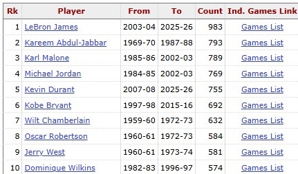 03月 04 2026 0 得分好手!布克生涯第350次砍下25+ 排名NBA历史第40位 xiaoqiao 2026-03-04 英超 60 1月24日讯 今天一场NBA常规赛,太阳对阵老鹰。截至发稿前,太阳球星布克21投12中,砍下31分4篮板3助攻1抢断。至此,布克生涯已350次砍下25+,排名NBA历史第40位。榜单前10如下: